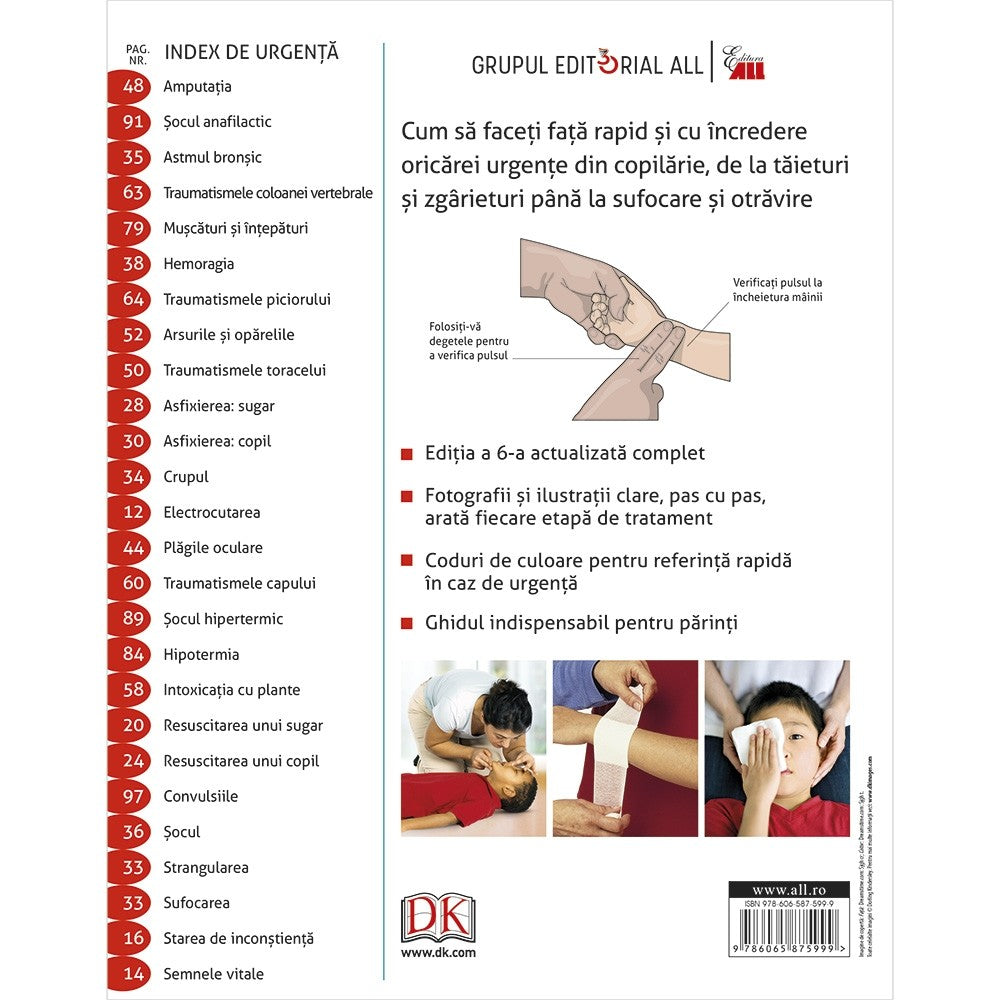 Primul ajutor pentru sugari și copii este ghidul binevenit în orice familie – cuprinde recomandări cât se poate de actuale, care pot salva vieți și pot conduce la cea mai bună abordare a leziunilor și a bolilor cu diverse grade de gravitate. Totul într-un format color, practic și ușor de utilizat.
